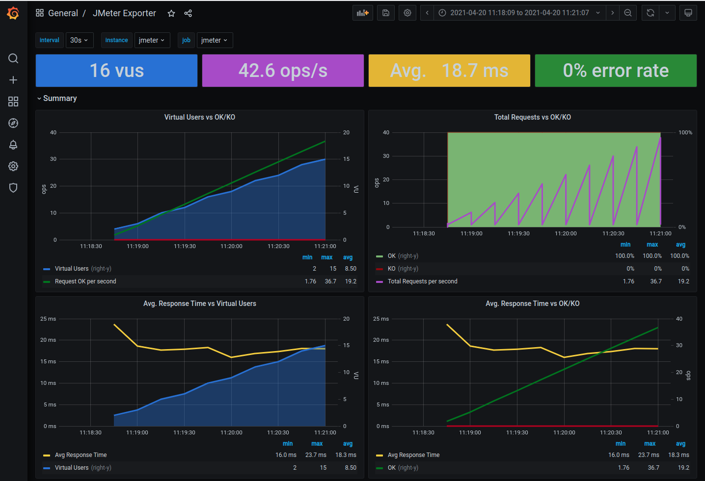 summary +    612 in 00:00:30 =   20.4/s Avg:    25 Min:     5 Max:   324 Err:     0 (0.00%) Active: 11 Started: 11 Finished: 0