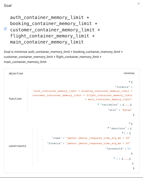 Goals and constraints are displayed in the Akamas UI when drilling down each optimization study.
