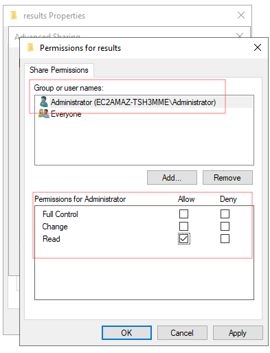 * the `..\results` folder has to be shared and the share name has to match the `shareName` provided in the telemetry instance configuration; in our provided examples "C:\Users\Administrator\Desktop\lr\results" has to be shared as "akamas" and be to be available as \lr\_hostname\akamas;