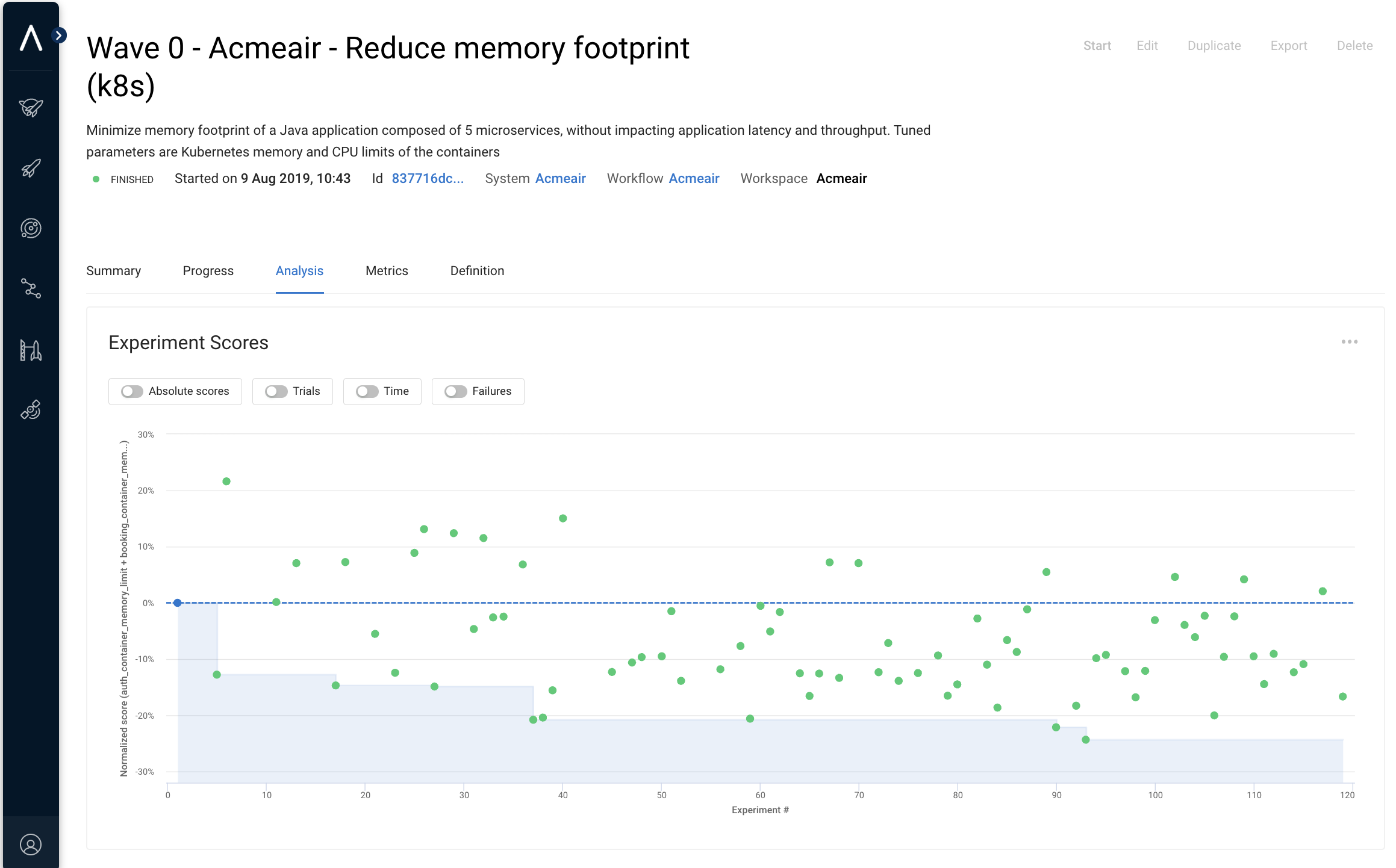 * the **Analysis** **tab** (see the following figures) displays how the baseline and experiments score with respect to the optimization goal, and the values of metrics and parameters for the corresponding configurations; this area supports the analysis of the different configurations;