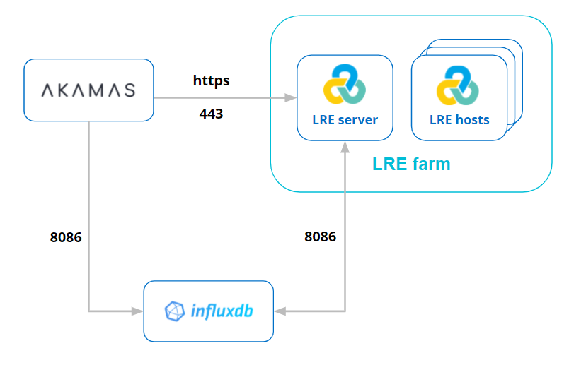 * bi-directional connection granted between the LRE server (the one exposing LRE APIs) and InfluxDB on port 8086.: this connection is used by LRE to store analysis data into InfluxDB;