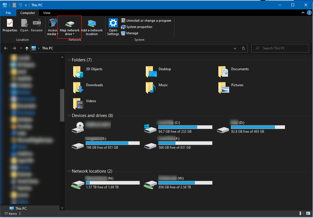 1. Open "This PC" from the Start menu, then click on "Map network drive"\\