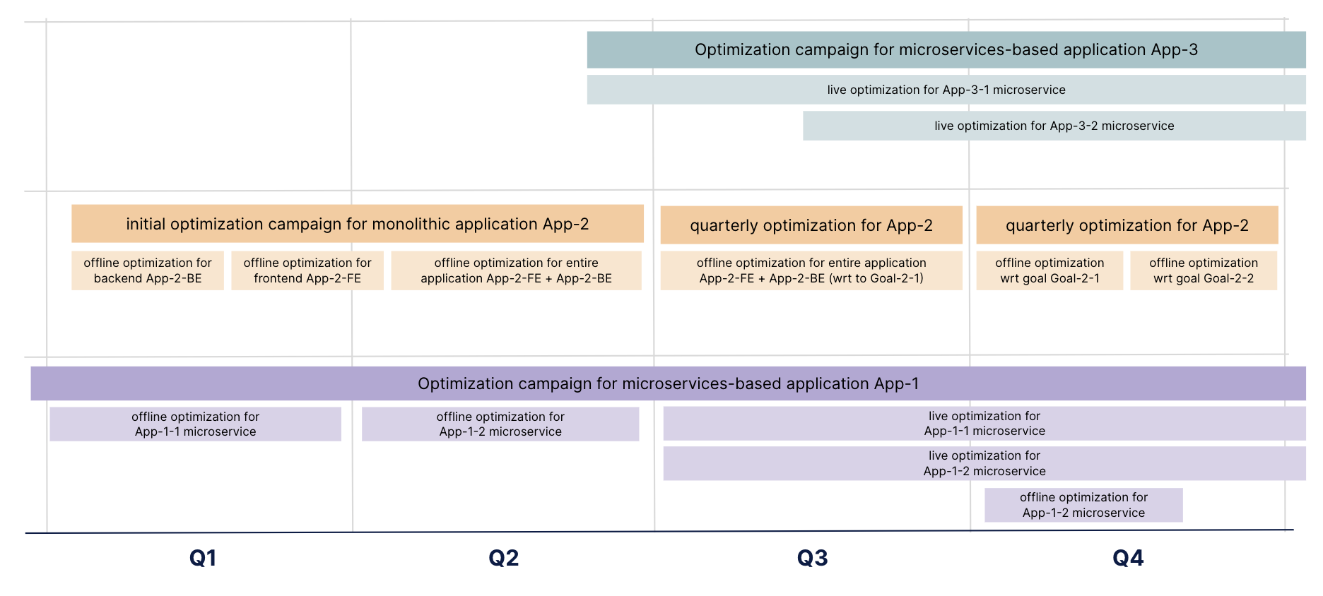 * the optimization campaign for the microservices-based application App-1 runs an offline optimization study for the App-1-1 microservice in Q1 and the App-1-2 microservice in Q2, before running live optimizations for both these microservices in parallel starting from Q3; notice that in Q4, possibly to anticipate a workload growth and assess the required infrastructure, an offline optimization for App-1-2 (possibly the most resource-demanding microservice) is also executed;