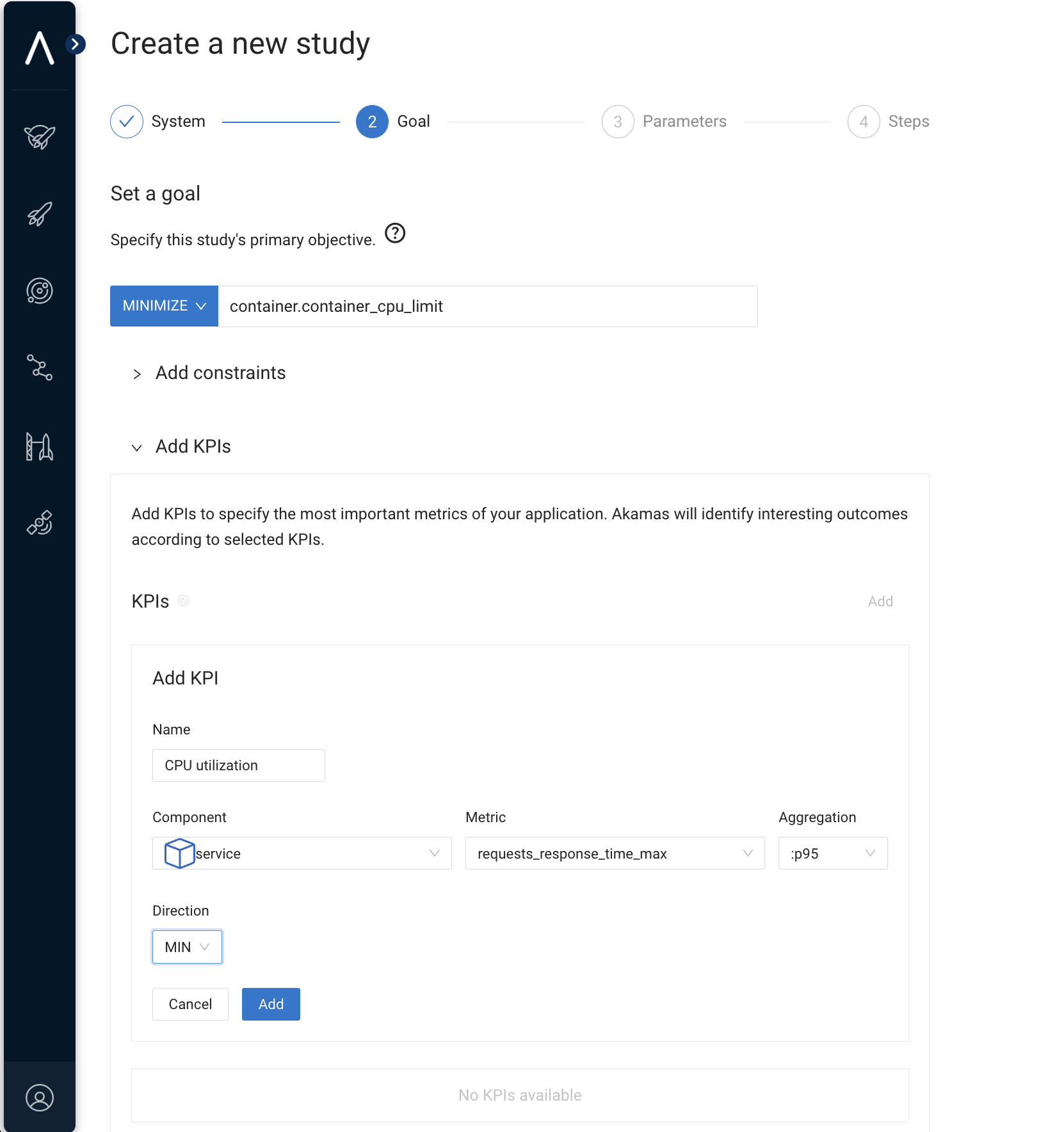 The [KPIs](https://docs.akamas.io/akamas-docs/3.2.2/akamas-reference/construct-templates/study-template/kpis) page of the [Study template](https://docs.akamas.io/akamas-docs/3.2.2/akamas-reference/construct-templates/study-template) section in the reference guide describes how to define the corresponding structure. Specifying the KPIs can be done while first defining the study or from the Akamas UI, at either study creation time or afterward (see the following figures).