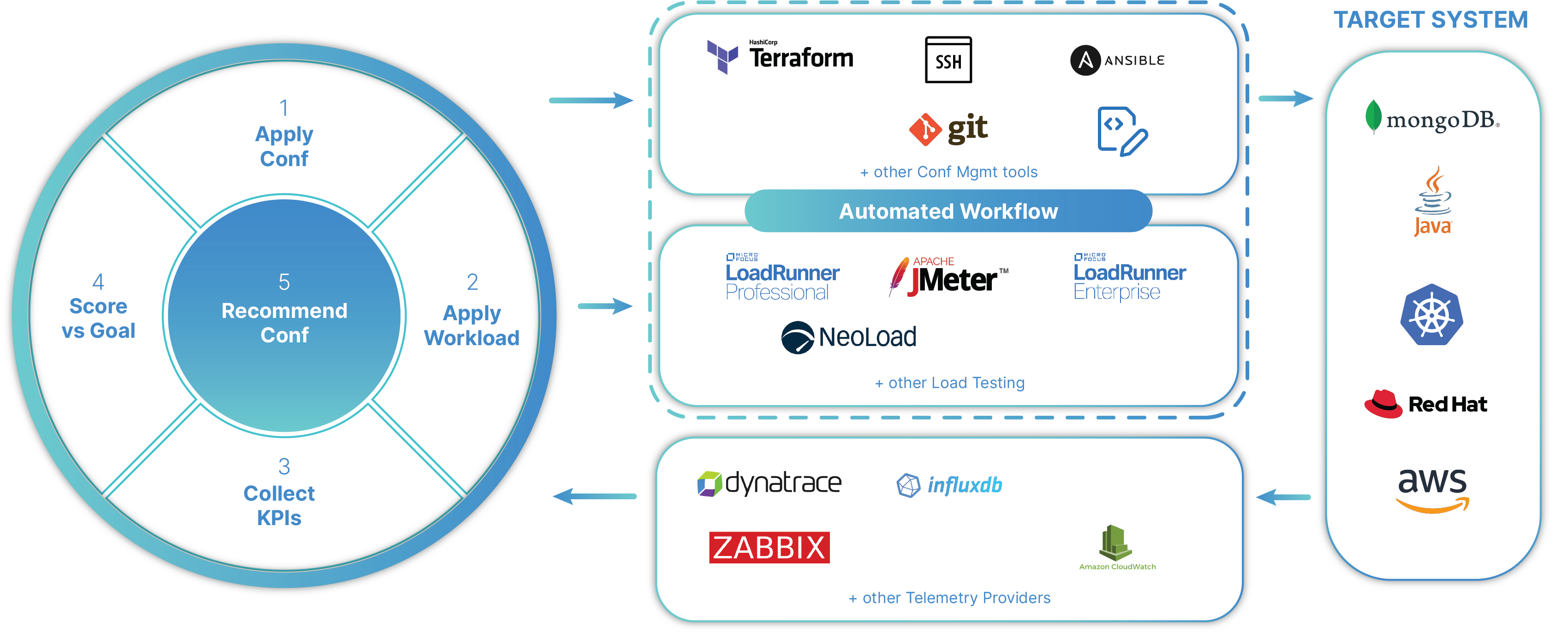 5. **Recommend Conf**: Akamas AI engine identifies the configuration for the next iteration until a termination condition for the study is met (e.g. number of experiments).
