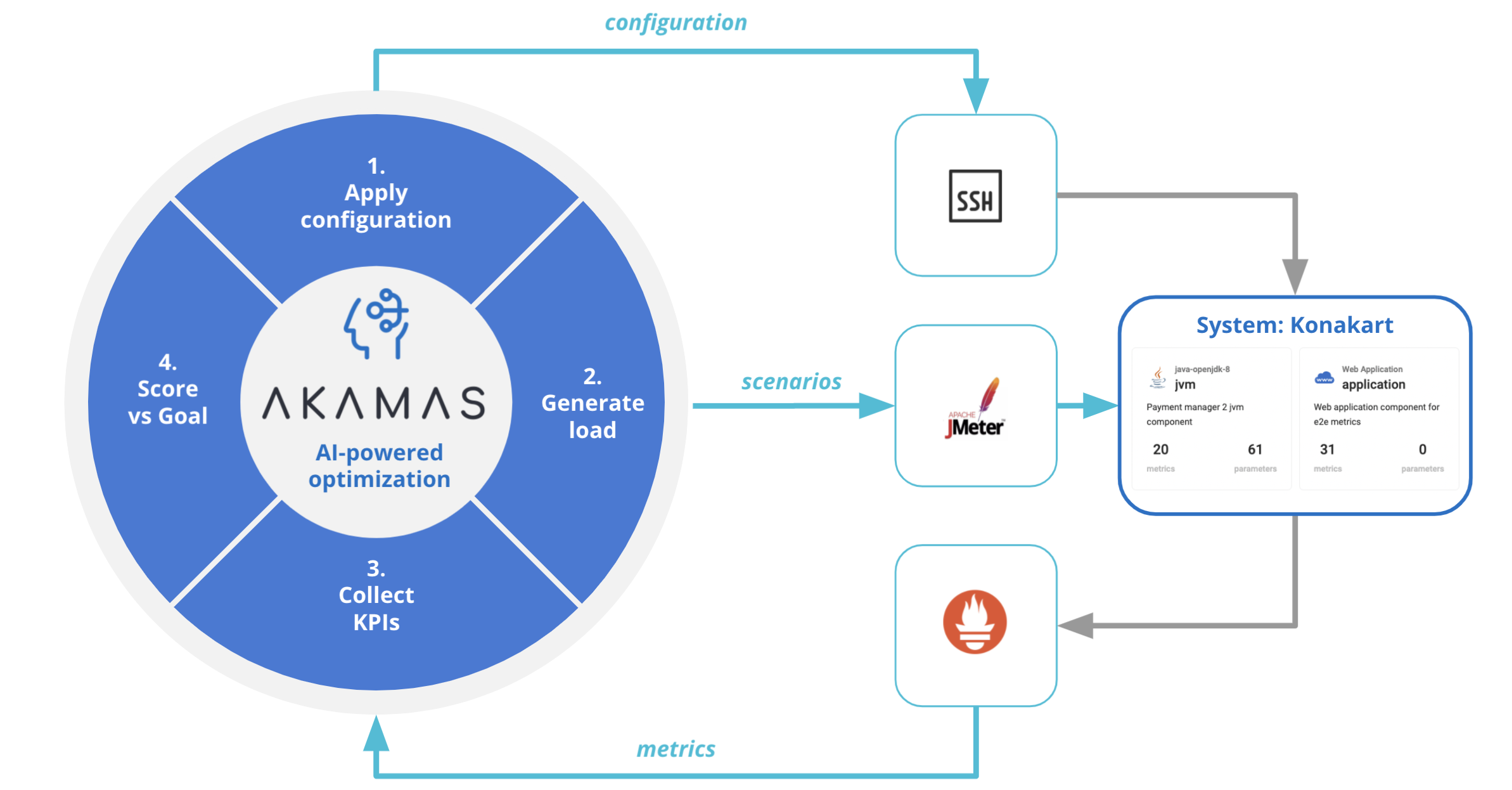 The following picture describes the high-level Akamas architecture that is enabled by this setup.