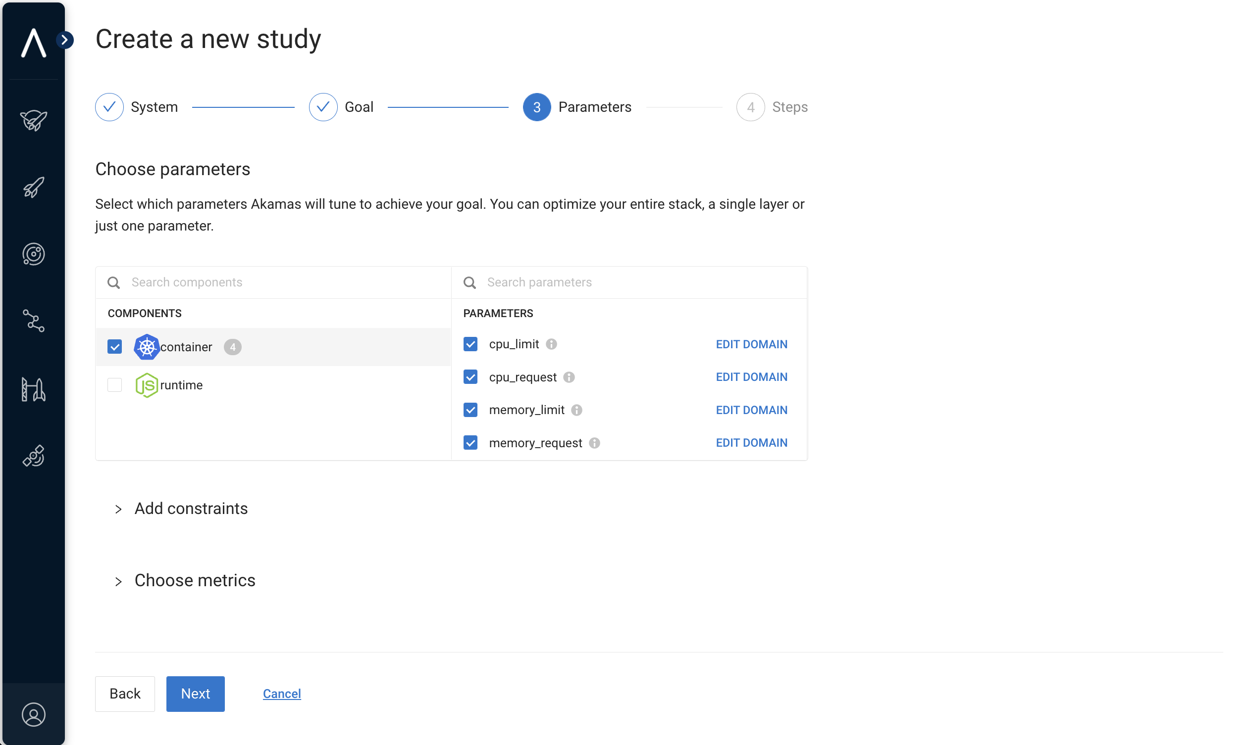 After defining the goal and its constraints, the following substep in creating an optimization study is specifying the optimization [parameters](https://docs.akamas.io/akamas-docs/3.3.0/akamas-reference/glossary/parameter) and [metrics](https://docs.akamas.io/akamas-docs/3.3.0/akamas-reference/glossary/metric). In particular, selecting the parameters that are going to be tuned to optimize the system is a critical decision that requires carefully balancing complexity and effectiveness. As for goals & constraints, also this step may require adopting an iterative approach. See also the [Best Practices](#best-practices) section here below.