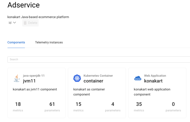 As shown in this figure, a supported component is the "web application", representing the end user perspective of the modeled system (e.g. response time). As expected, this component type only provides measured metrics and no tunable parameters.