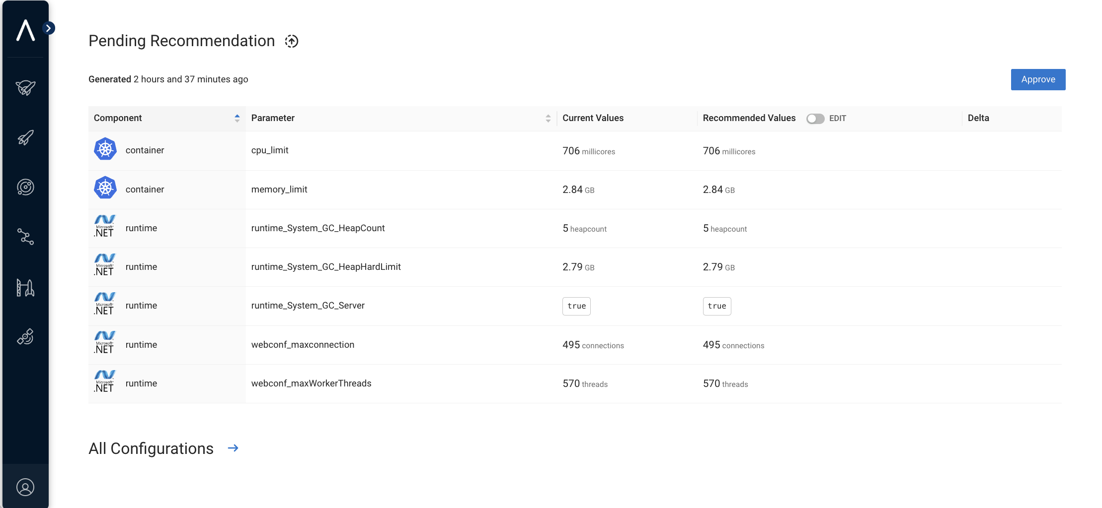 in the case of a recommendation mode, the Pending configuration section (see the following figure) shows the configuration that is being recommended to allow users to review it (see the EDIT toggle) and approve it: