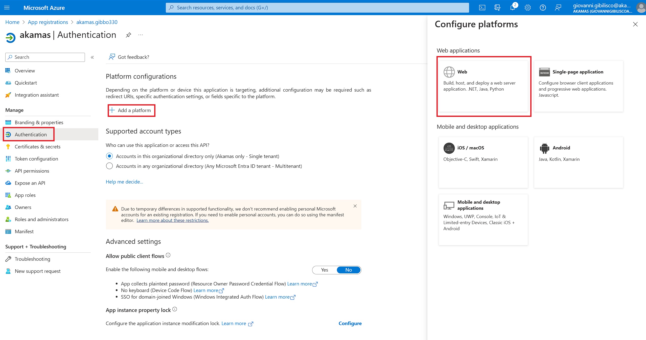 Back to the *app registration* in the Azure portal, navigate to the "Authentication" section. Add the "Web" platform (if not already present).