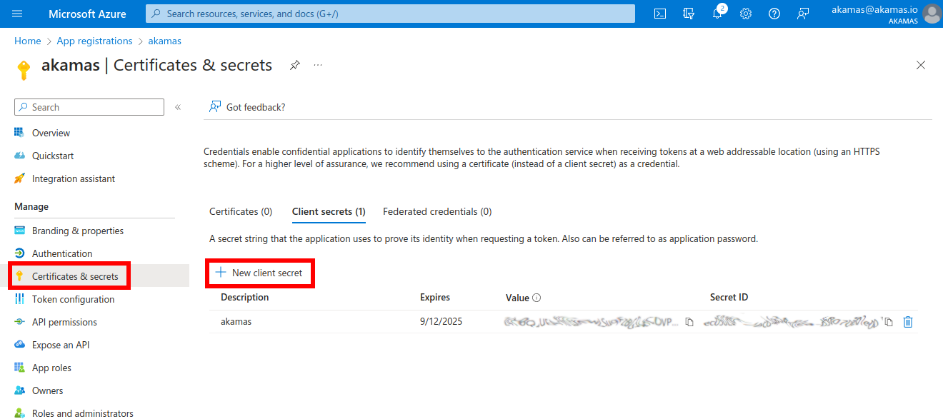 Furthermore, in the "Certificates & secrets" section, create a new *Client secret* and note its value.