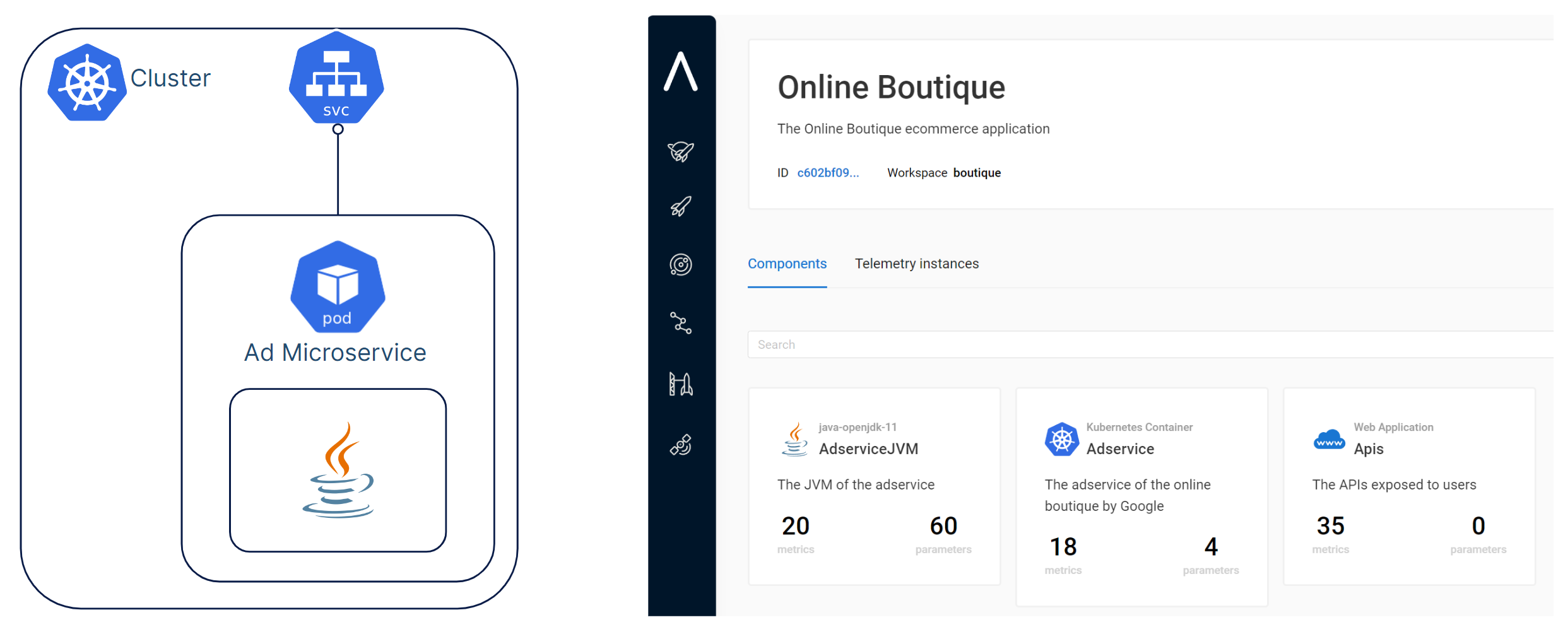 Recalling our example of the Online Boutique application, we decided, for the moment, to model just the elements that are included in the optimization initiative. We have also decided not to model the entire Kubernetes cluster as we are not interested in optimizing and monitoring it at this stage.
