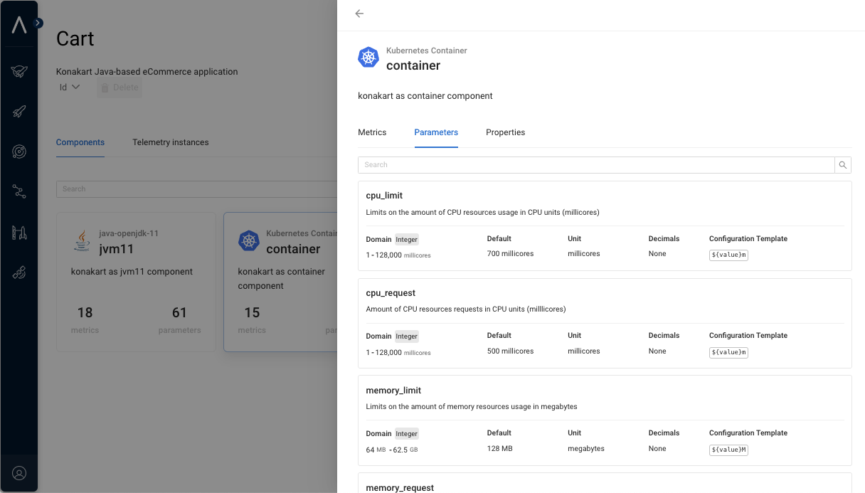 Parameters are displayed in the Akamas UI when drilling down to each system component.