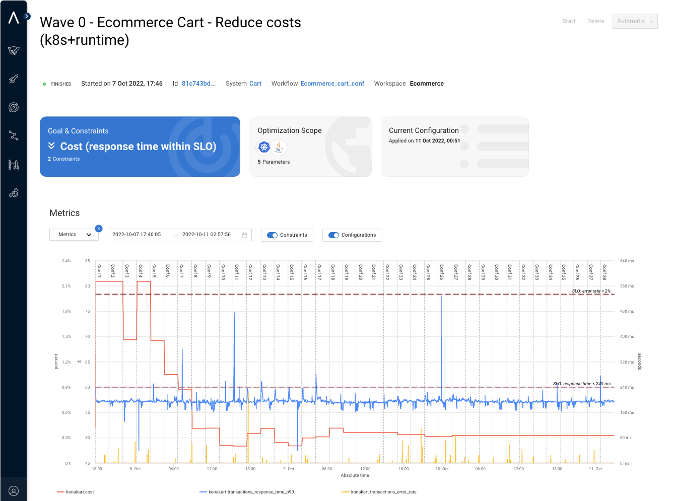 Live optimizations are run usually for a longer period compared to offline optimizations and their effect on the goal and the constraints is more gradual. For this reason, Akamas offers a specific UI that allows users to evaluate the progress of live optimizations and compare many different configurations applied by looking at the evolution of core metrics.