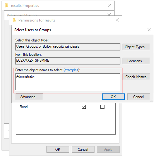 6. In the textbox type the name of the user or the group (with the domain if required) that you want to grant access to the share, then click "OK"\\