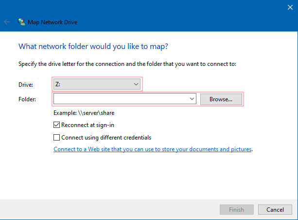 2. In the "Map Network Drive" window, select a suitable drive letter name and enter the remote folder path of the network share that has been given to you by your storage admin (it should be something with the format \\\mycompanyshareserver.mycompany\foldername)\\
