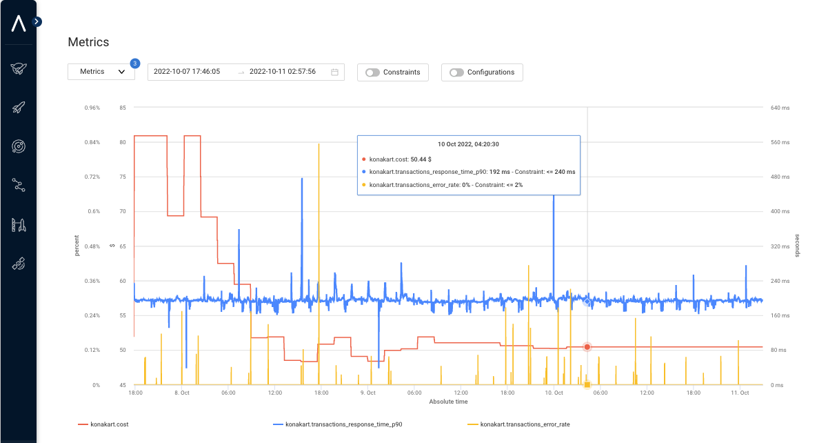 Metrics are used to both specify the optimization [goal and constraints](https://docs.akamas.io/akamas-docs/3.6/reference/glossary/goals-and-constraints) (e.g. minimize the heap size while keeping response time < 1000 and error rate <= 10% of a baseline value), and to assess the behavior of the system with respect to each specific configuration applied.