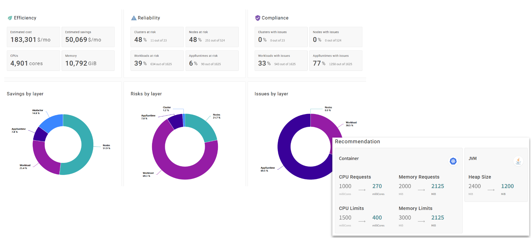 * **Designed with safety in mind**: recommendations are full-stack and consider the application running within the pod. This avoids reliability risks such as out-of-memory errors or CPU throttling, hence are trusted by development teams.
