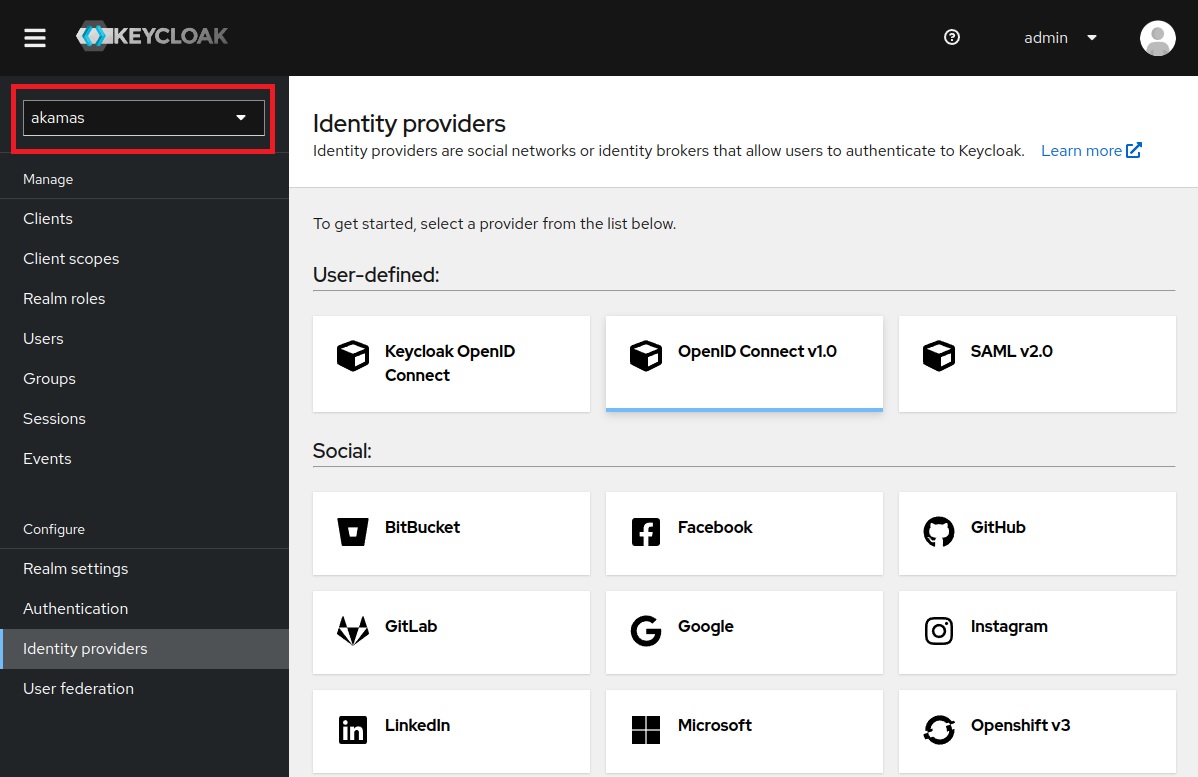 Within the **Akamas** realm, navigate to the **Identity Providers** section.
