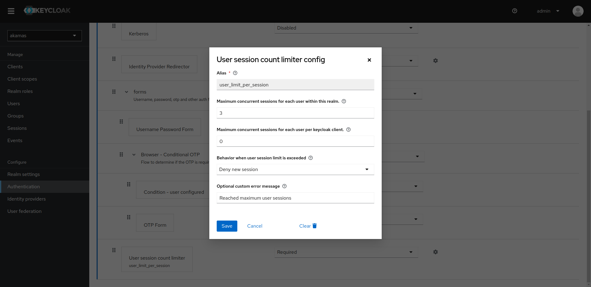 On the row "User session count limiter", click on the cog icon. From here you can choose the maximum concurrent sessions for each user, and the behavior when the maximum number is reached. Select "Deny new session" to deny new accesses. if previous sessions are not properly terminated, you may need to delete them from the Keycloak console under the Users section.
