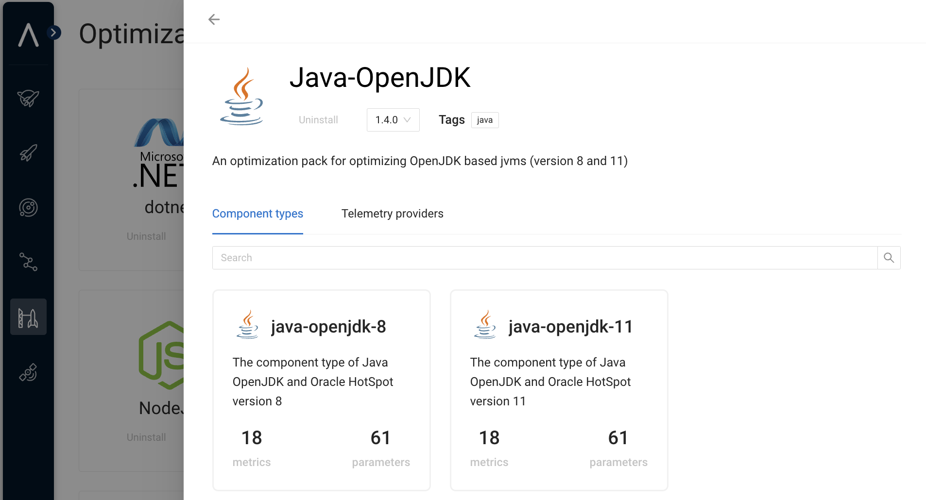 The following figure shows the out-of-the-box JVM component types related to the JVM optimization pack.