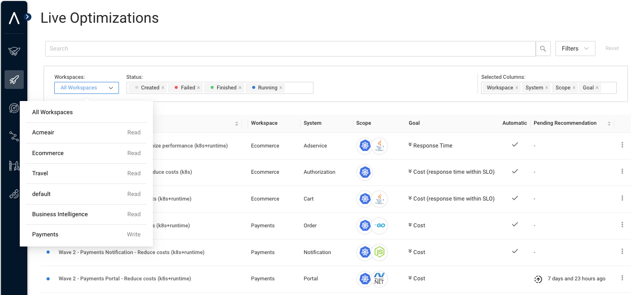 A workspace is an Akamas resource that can be managed via CLI using the resource management commands. See also this page devoted to commands on how to define users and workspaces.