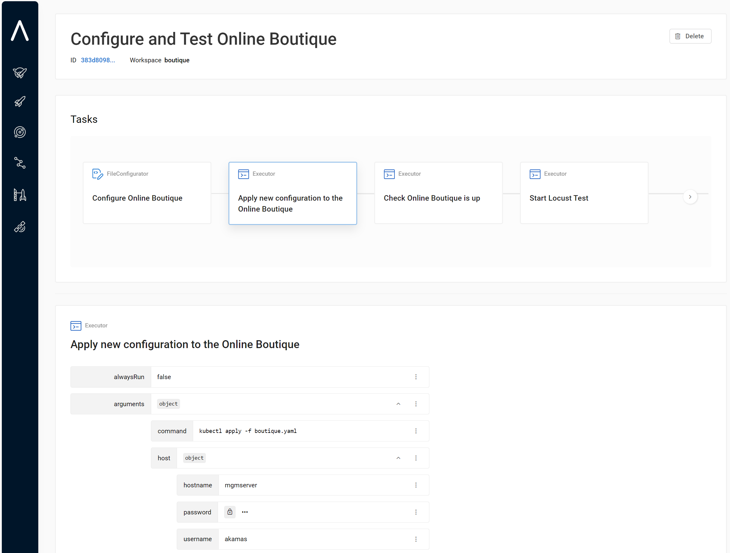 The workflow that we will create to allow Akamas to evaluate the configurations comprises the following actions: