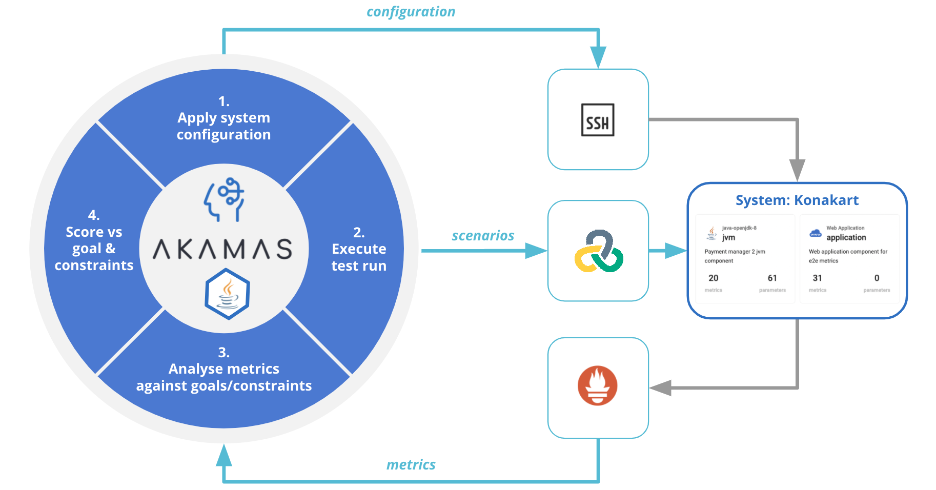 The following picture represents the high-level architecture of how Akamas operates in this scenario.