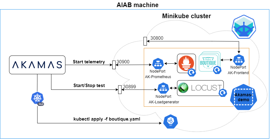 There are two possible architectural configurations, depending on whether you are using a dedicated cluster or running the application on Minikube inside your Akamas-in-a-box machine: